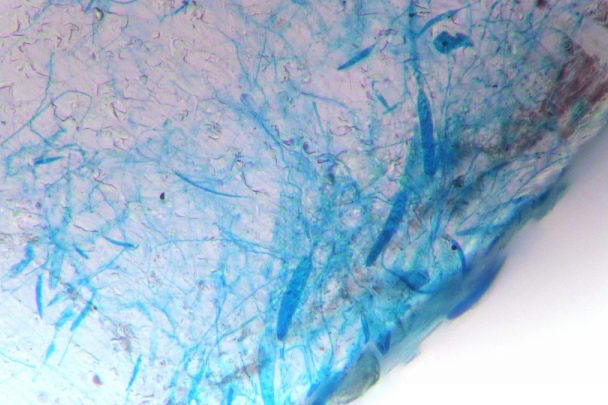 Photo: Stinging cells from a coral’s tentacles can be seen on a plastic particle, which was removed before it could be eaten. The cells are dyed blue for visualization. Photo: Alex Seymour